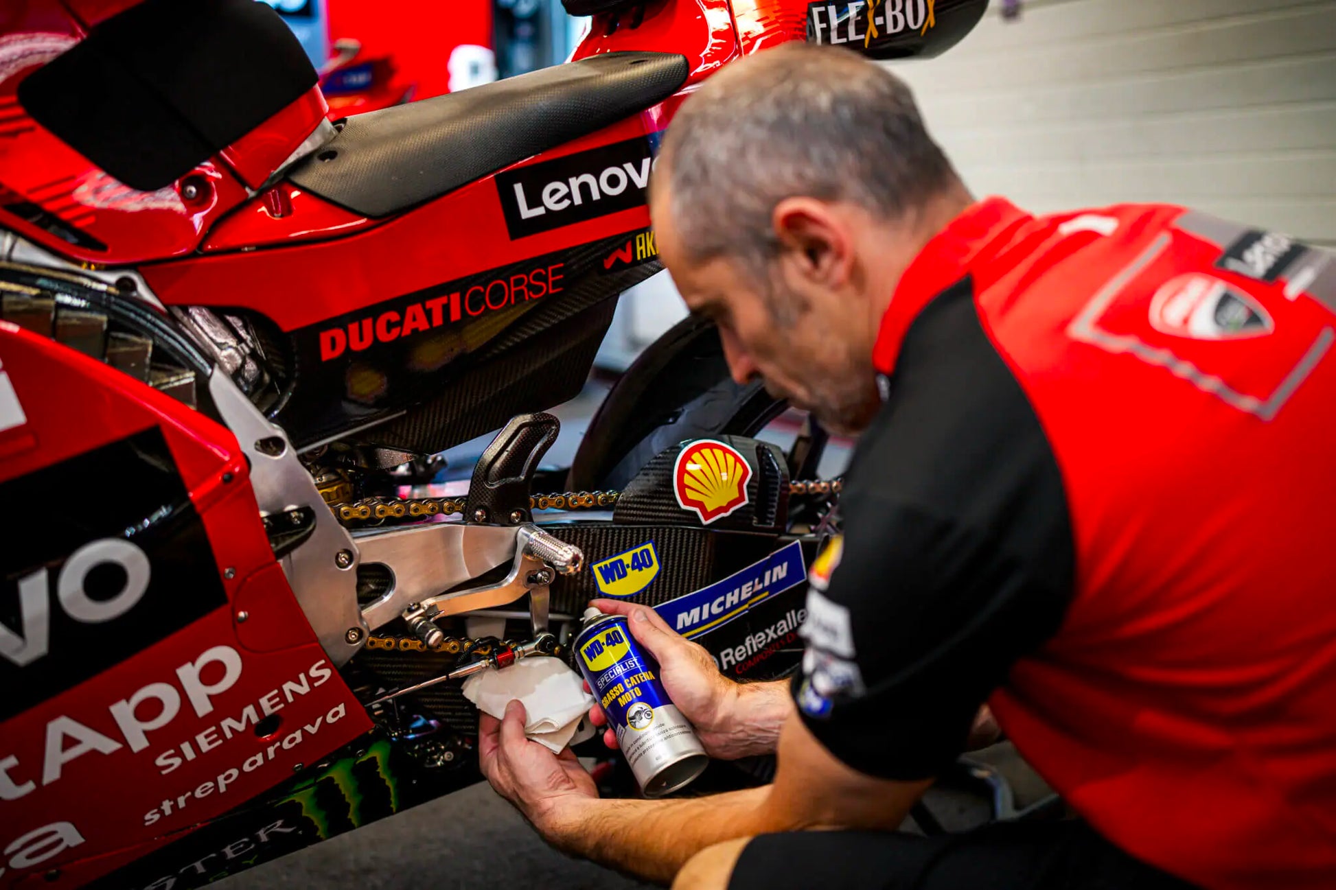 - Limpia la cadena, corona y piñones antes de aplicar la grasa (se recomienda el uso del limpiador de cadenas de la gama WD-40 Specialist Moto).
