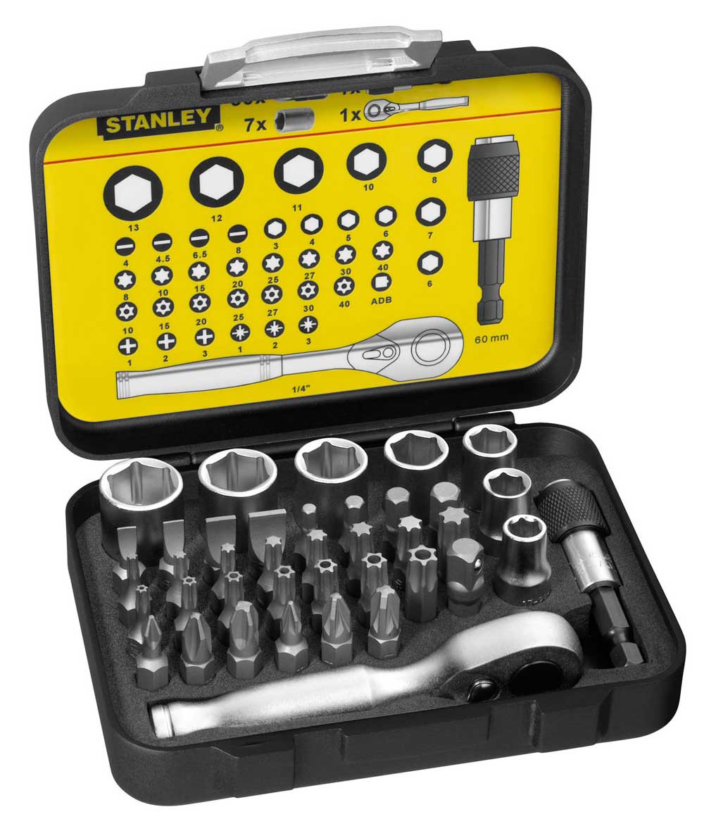 The Stanley 39-Piece Set includes screwdriver bits, a mini ratchet wrench and socket wrenches. A perfect and complete case to always carry with you. Includes magnetic bit holder.