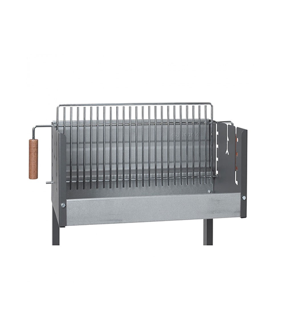 Dancook Mod.7300 Grill. Charcoal barbecue with anthracite enamel with Teflon-maintaining surface, heat-resistant aluminum coated tray. It has a robust 6 mm chrome grille, adjustable in four positions. Vertical barbecue using the rotisserie and electric motor. It incorporates wooden side tables with FSC forestry certification.