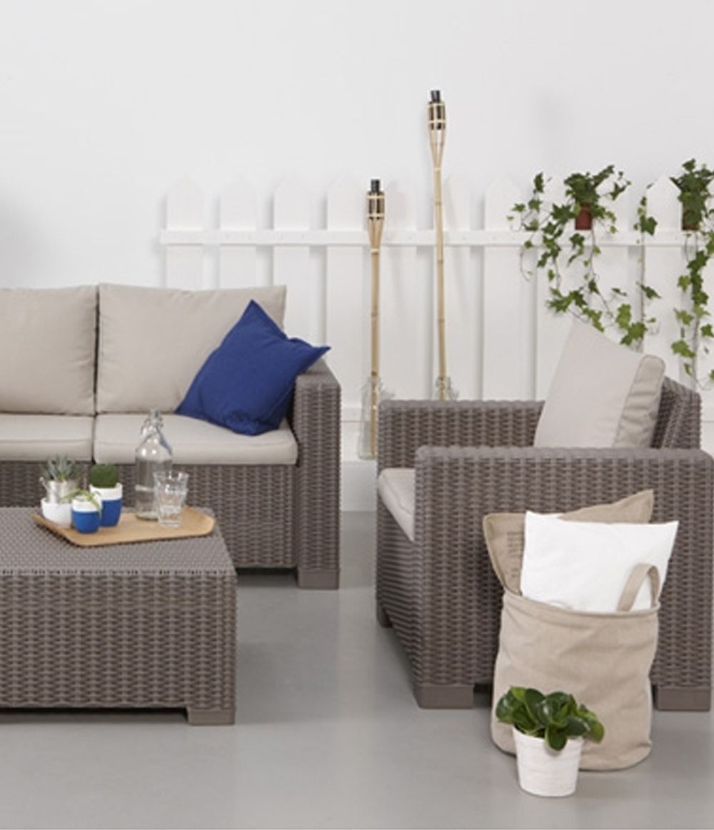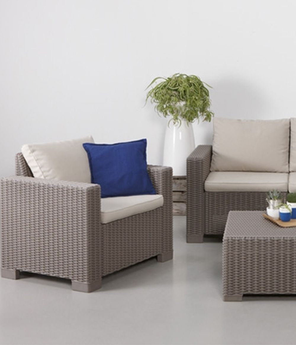 The California garden furniture set from the Curver brand is an exceptional 4-piece set consisting of a garden table, two chairs and a sofa. In addition, it includes 8 sand-colored cushions to make the stay even more comfortable.