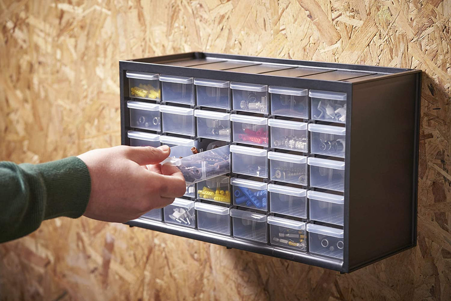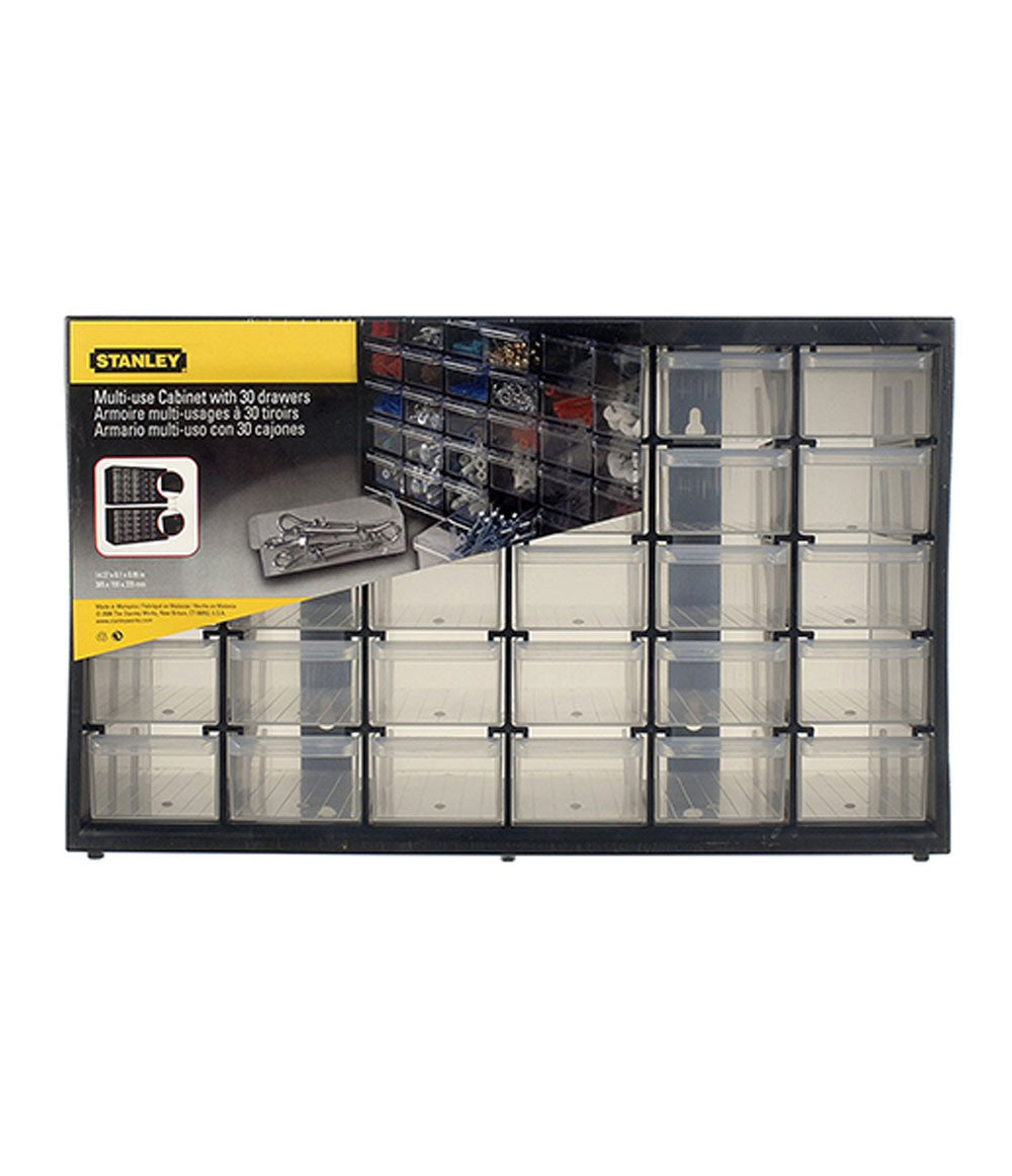 Drawer with 30 Organizers 1-93-980 from Stanley. This multi-purpose storage drawer from Stanley has 30 small drawers that are transparent for easy visibility of what they contain for easy access to parts.