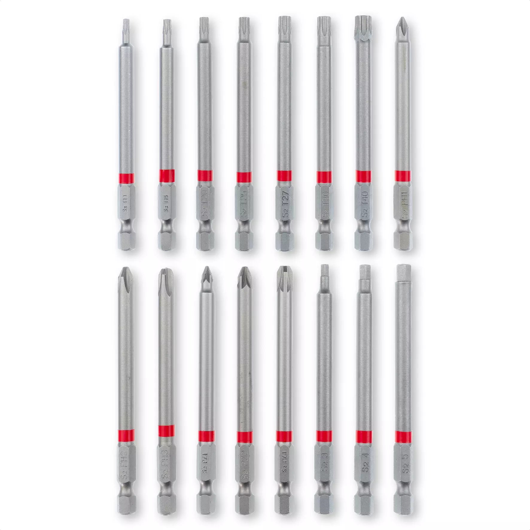 • 16 bits, each 90 mm long , made of sandblasted S2 steel, known for their strength and durability. The bits include: