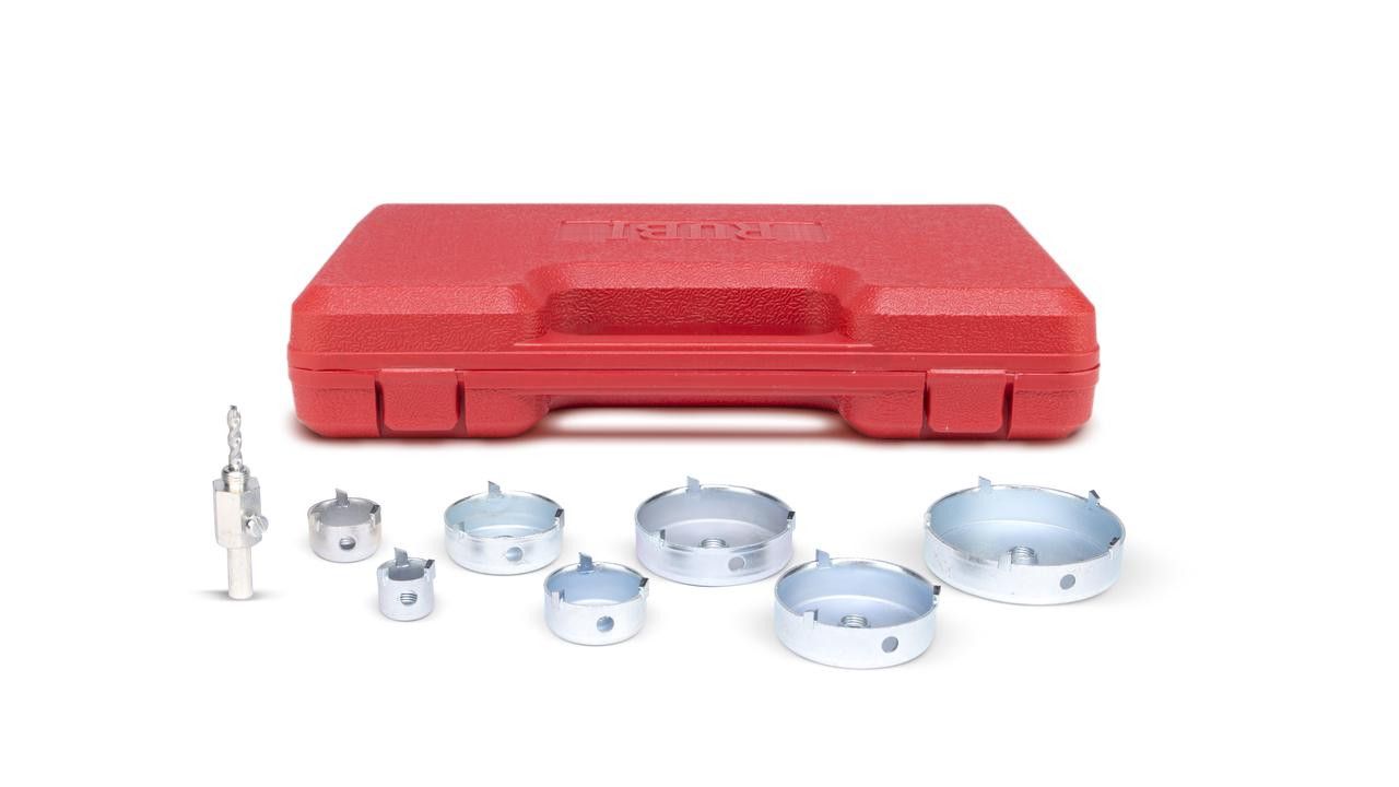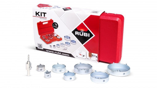 Drill kit with case from the Rubi 4995 brand. It consists of a head with centering drill and Tungsten Carbide drills of Ø 27, 35, 45, 55, 65, 70 and 85 mm, with a plastic case.