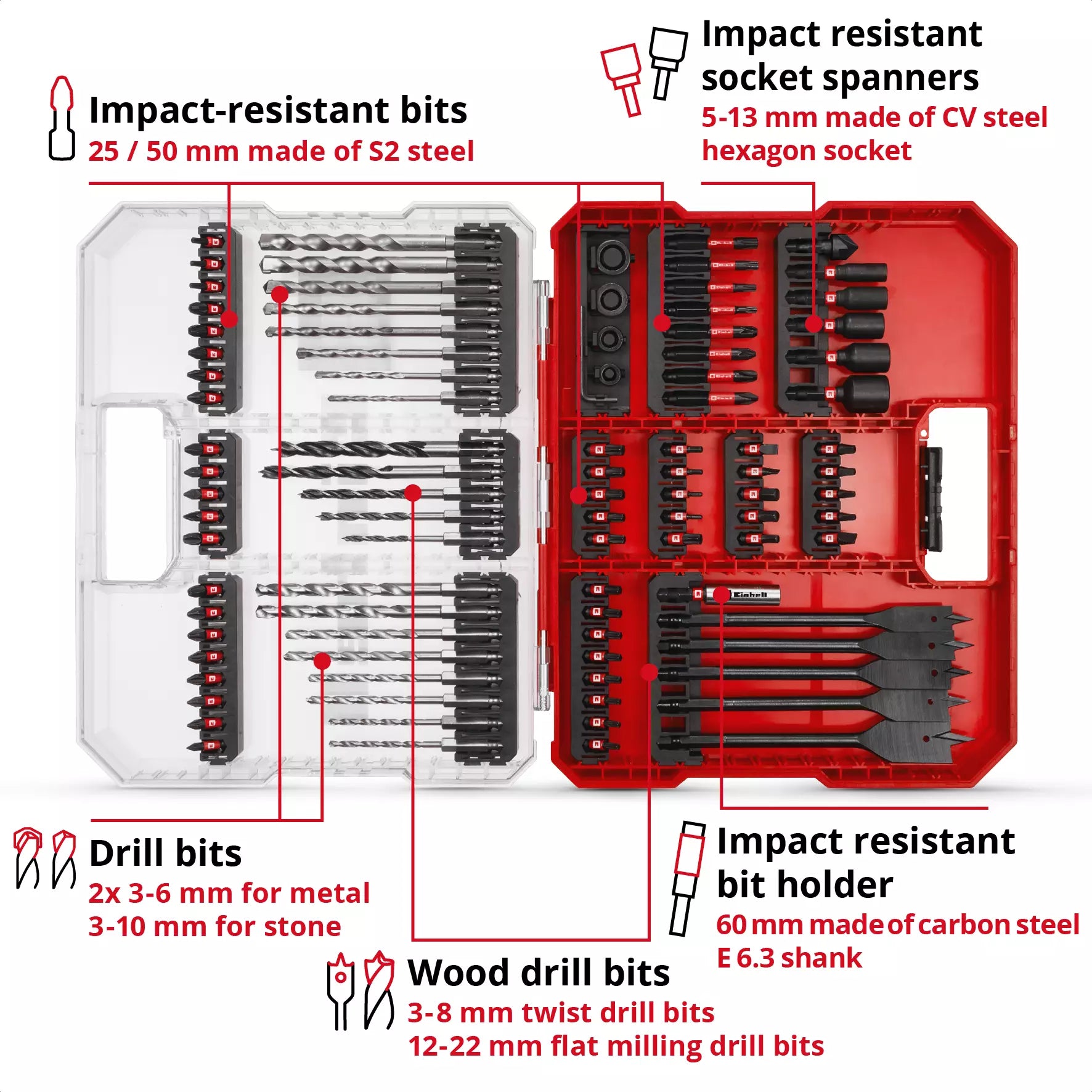 - High-quality materials: The drill bits and tips are made of durable materials that ensure a long service life and optimal performance in a variety of applications.